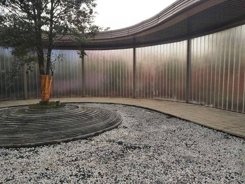 圓弧U型玻璃整個(gè)墻面透視模糊墻外的事物,外面看里面,里面看外面都像一風(fēng)景畫(huà)!