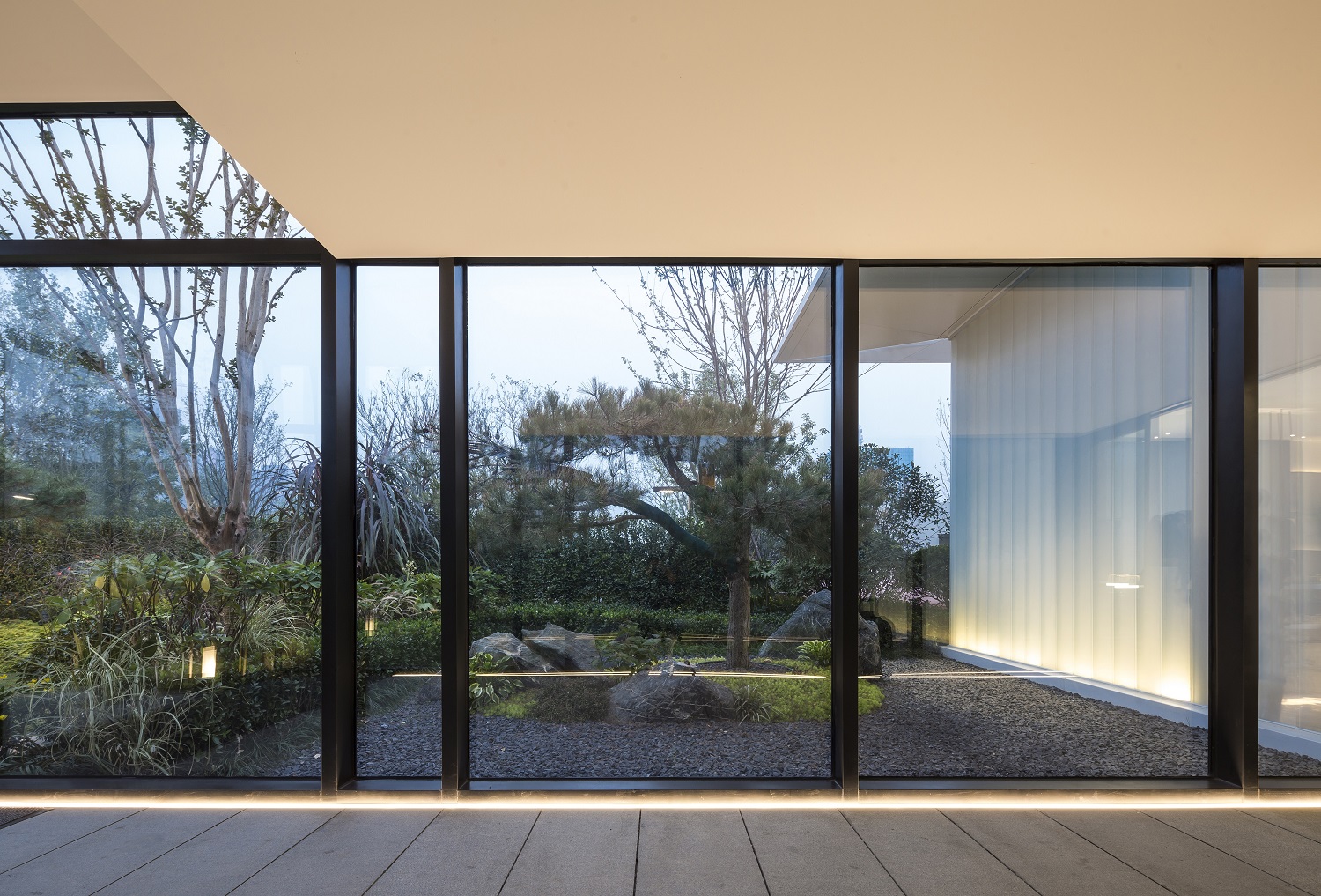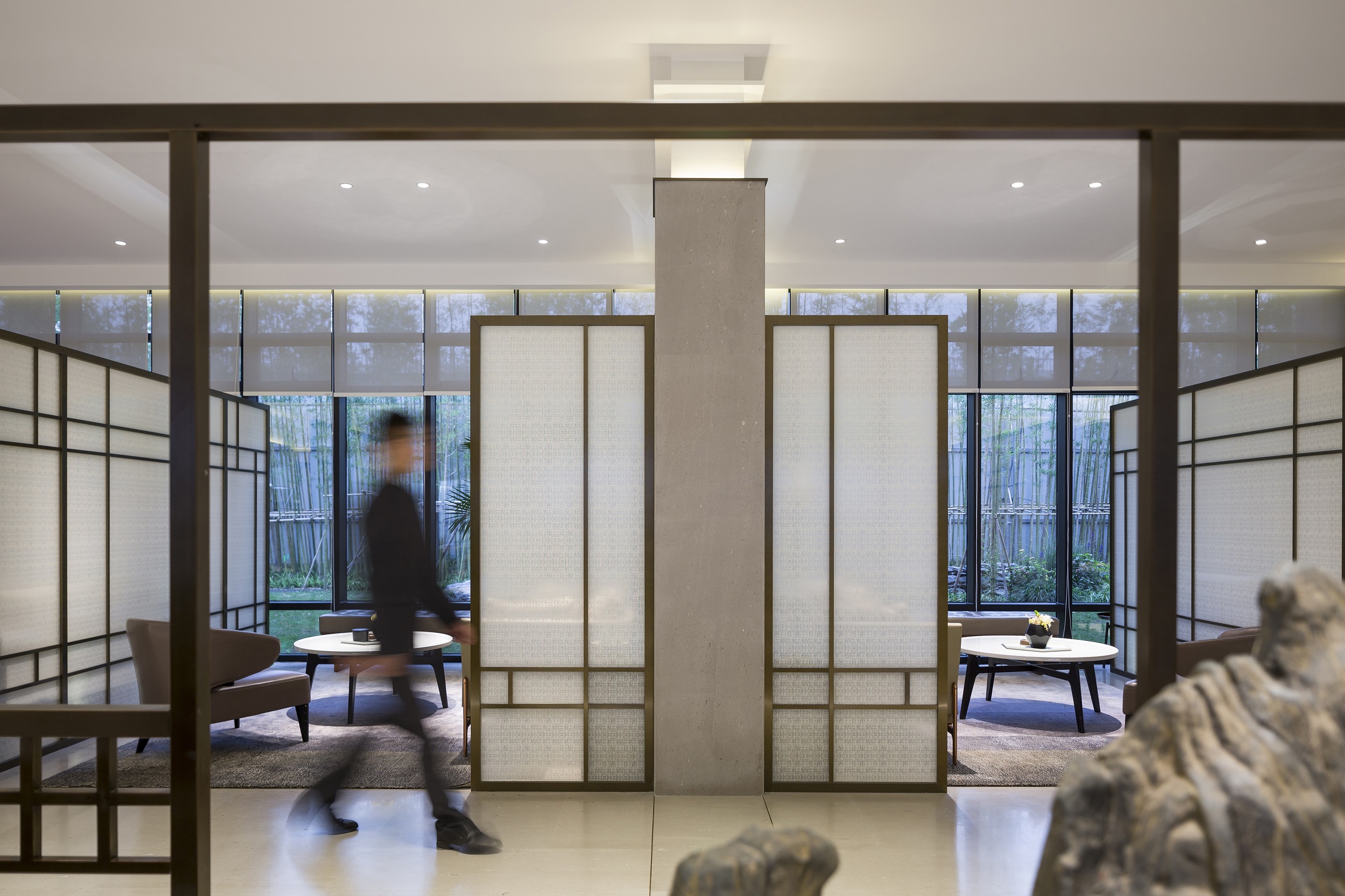 隱隱約約的光影是來(lái)自自然的饋贈(zèng),亦是室內(nèi)最美的裝飾?!癠”形玻璃的運(yùn)用,把光影請(qǐng)進(jìn)了室內(nèi),由內(nèi)而外,讓樹(shù)影婆娑,爬滿建筑,讓光影成為四季的??汀?/p>