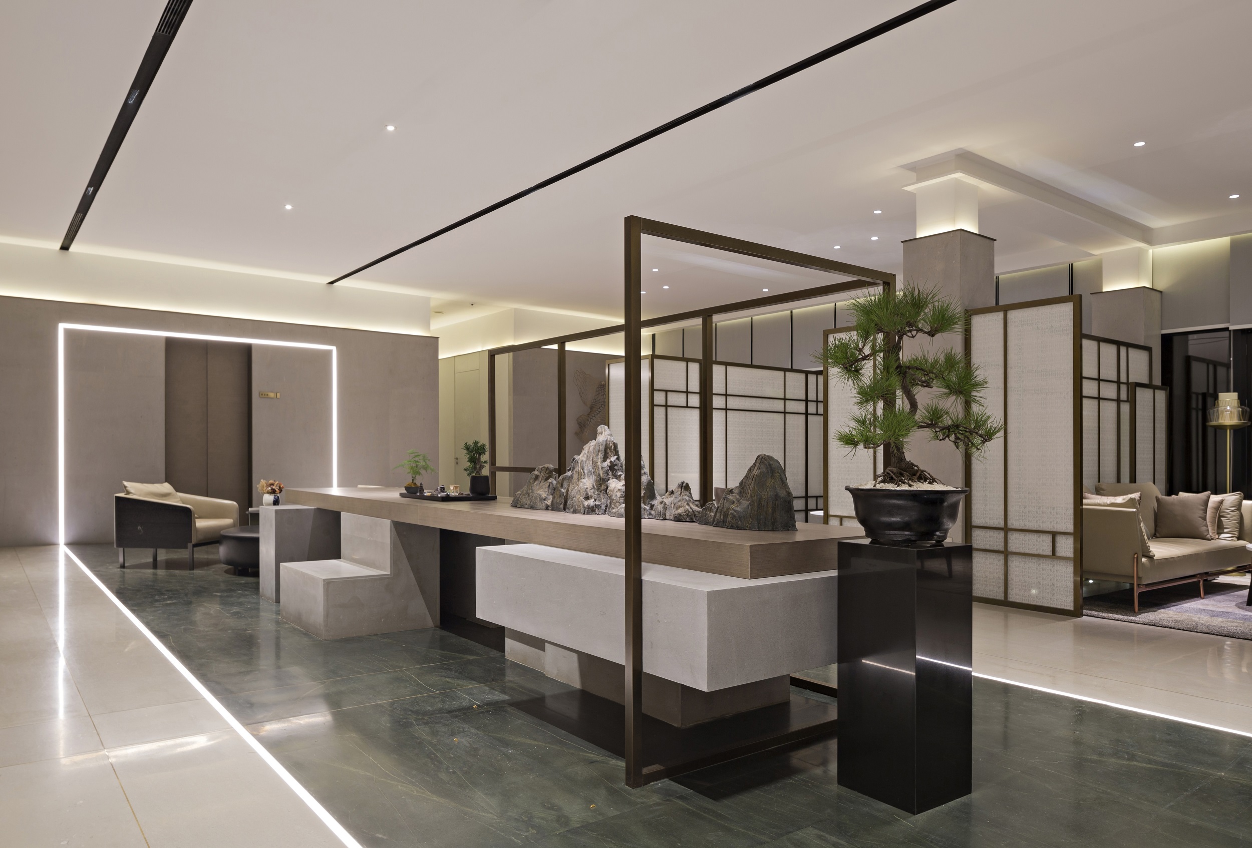 在一個(gè)大道至簡(jiǎn)的空間內(nèi),利用線面之間的交織重疊,它可以是燈帶、燈的形態(tài)等,這些簡(jiǎn)約的線型演繹,將視覺(jué)延伸到立體的空間中。